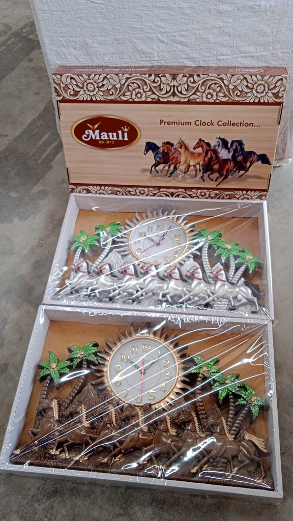 Elevate the aesthetic of any room with this beautifully designed wall clock featuring a majestic running horse motif, palm trees, and a radiant sunburst dial. Crafted with precision, the clock combines traditional elegance with modern durability. Made of high-quality plastic with detailed artwork, it serves both as a timepiece and a decorative wall accent. The clock operates on a standard battery and keeps accurate time with a silent sweep mechanism. Perfect for adding a dynamic visual appeal to living rooms, lounges, offices, or gifting on special occasions.