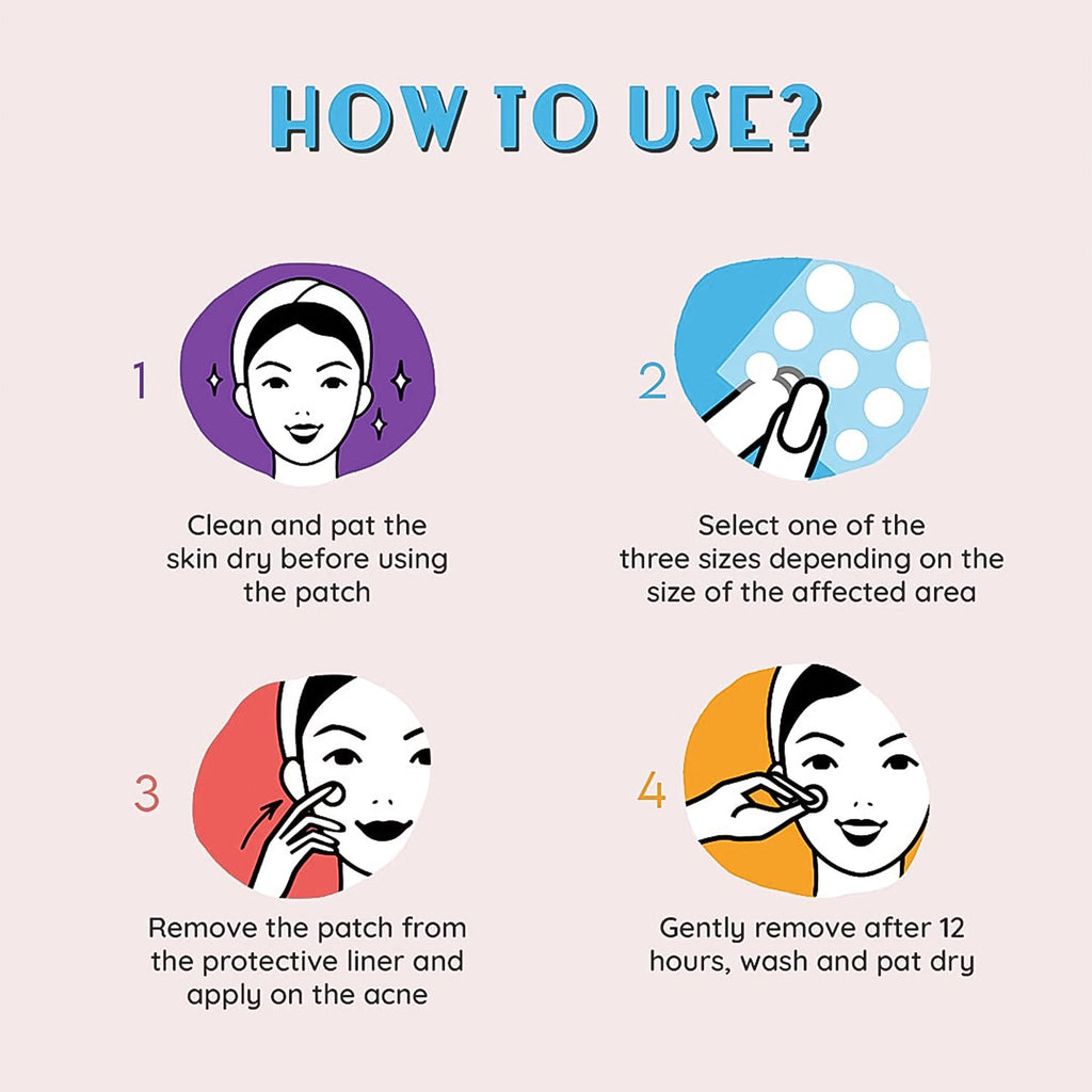 • The acne patches for face are virtually invisible, so you can wear them whenever you need to. Most people typically apply their zit patches for face before going to bed and let the acne stickers work their magic. After 6-10 hours, gently peel your acne patches off and repeat as necessary.